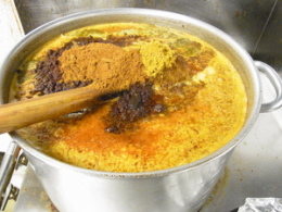 チキンと香味野菜で取った スープを加え 20種類のスパイスで 味と香りを作っていきます。